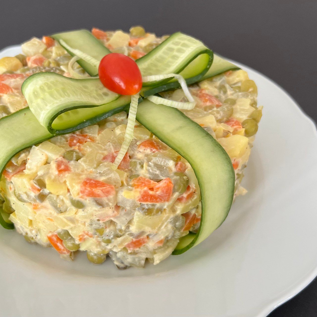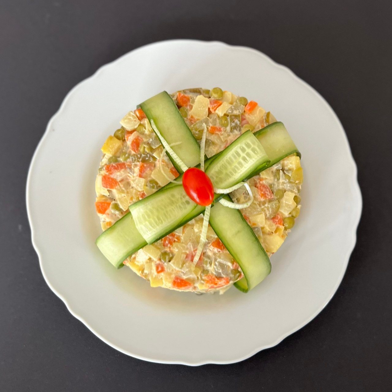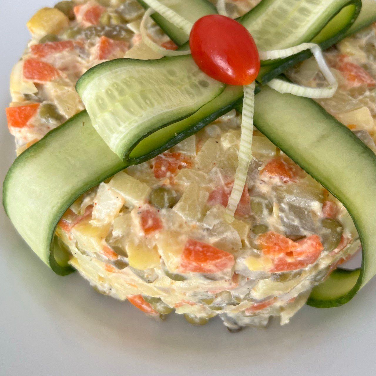 Pagaminta iš šviežių virtų bulvių, morkų, raugintų agurkų, žirnelių ir kiaušinių, pagardinta švelniu majonezo bei grietinės padažu.