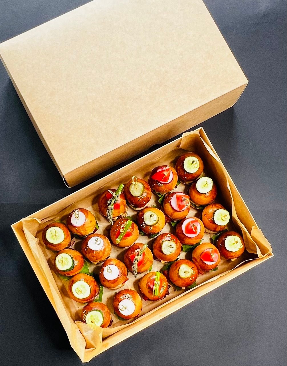 Burgerių dėžutė „Asorti“ – tai skanių mažųjų sumuštinukų kolekcija, tinkanti bet kokiai šventei!