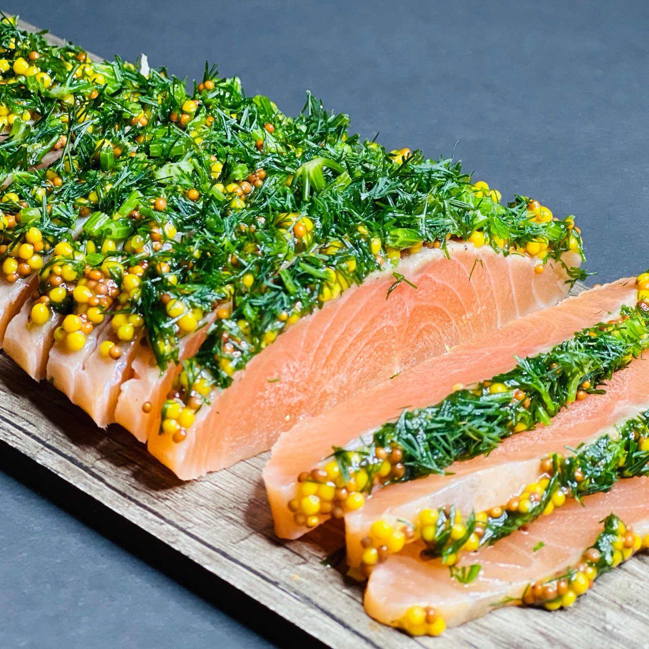 Rankų darbo sūdyta lašiša, marinuota su apelsinų, citrinų sultimis ir šviežiais krapais.
